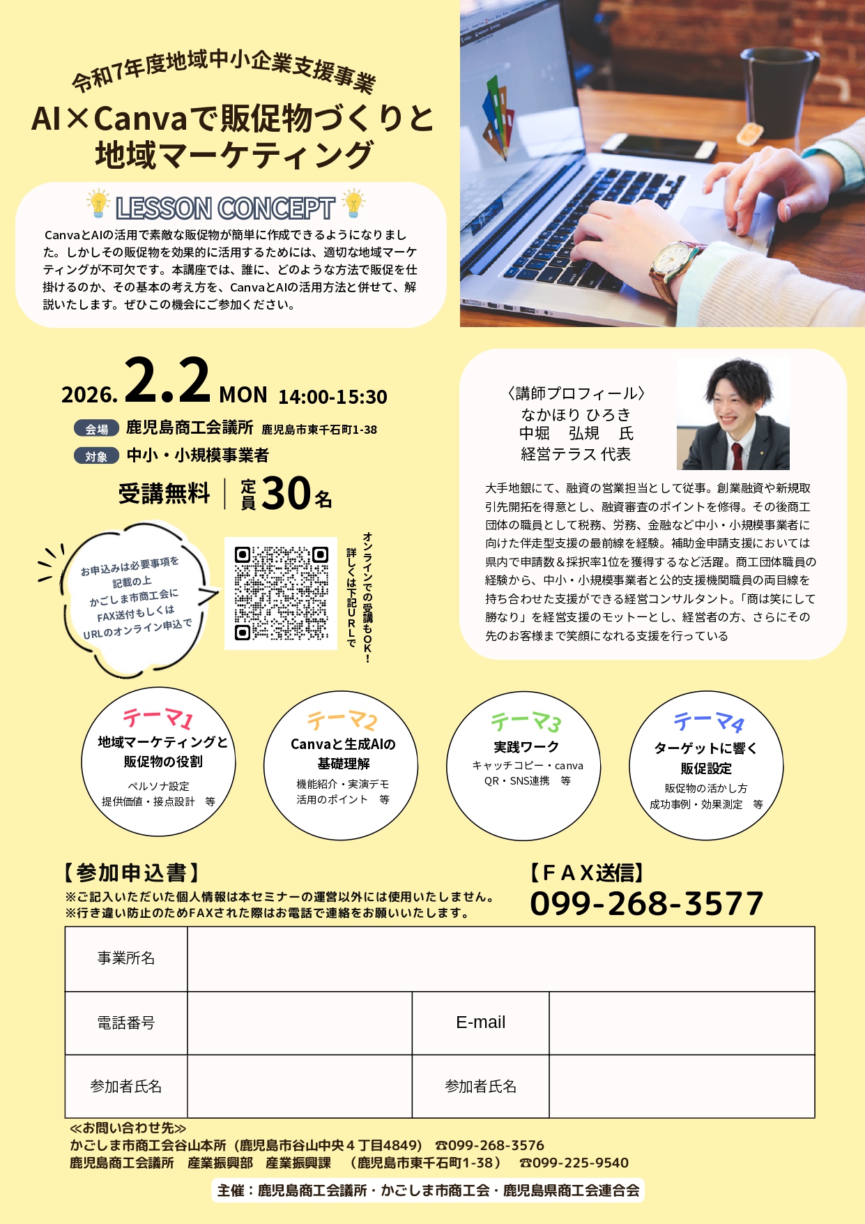 2月2日(月)14:00~15:30に鹿児島商工会議所にて「AI×Canvaで販促物づくりと地域マーケティングセミナー」が開催されます。