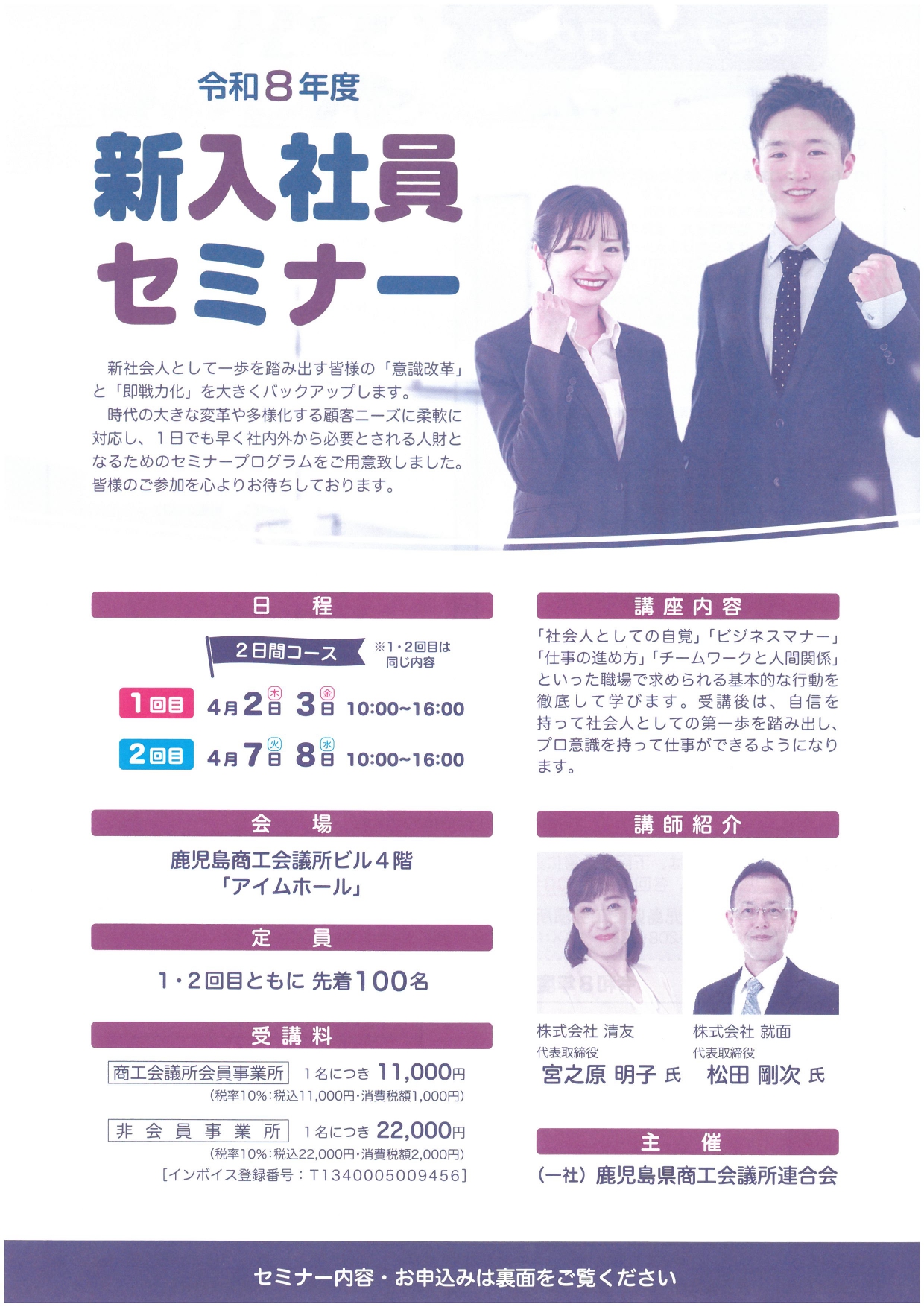 4月2日(木)~3日(金)、4月7日(火)~4月8日(水)の両日程で、鹿児島商工会議所4階アイムホールにて「令和8年度 新入社員セミナー」が開催されます。